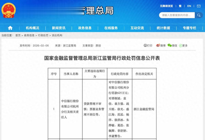 近日,国家金融监督管理总局浙江监管局行政处罚信息公开表显示,中信银行杭州分行,因贷款管理不审慎;票据业务管理不到位等,被罚款625万元;对邵炳斌、袁佳、翁方强、战天植、徐光、盛江海、沈泓、杨洋、徐洪冰、朱烨敏、葛浩、张佩卿、章舒妍、李葳警告。