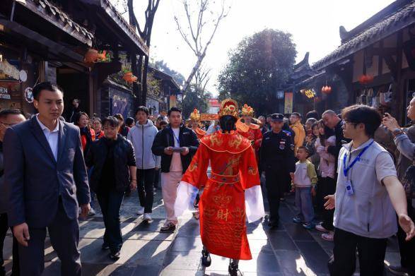 与往年不同的是,今年的宽窄巷子“迎财神巡游”活动里多了一位“特殊成员”——身着红装的智能机器人,呆萌又喜庆的造型让它一下成为焦点。喜庆机器人与传统“财神爷”并肩而行,抱拳作揖、语音送福,引得不少游客举起手机,跟着巡游队伍一路拍摄。